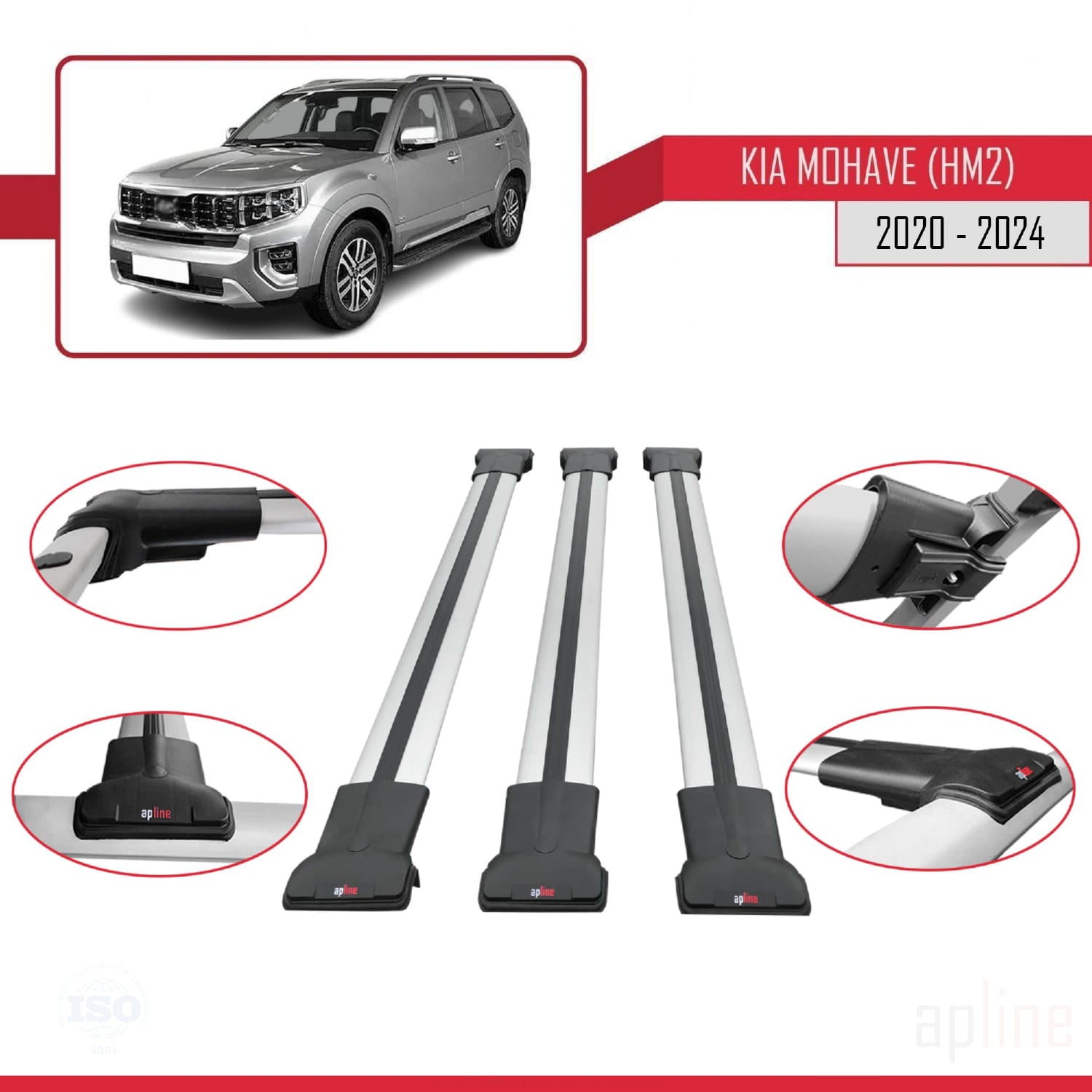 Compatible avec Kia Mohave 2 (HM2) 2020-2024 FLY Model Barres de Toit Railing Porte-Bagages de Voiture Gris Aluminium 3 Barres