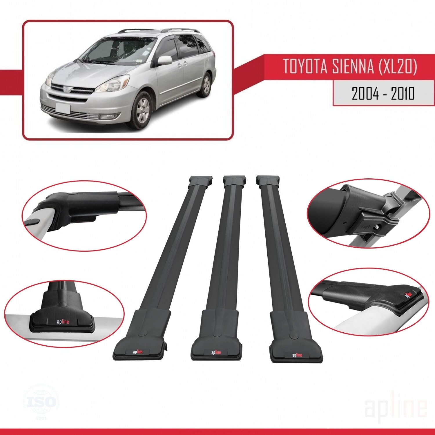 Compatible avec Toyota Sienna 2 (XL20) 2004-2010 FLY Model Barres de Toit Railing Porte-Bagages de Voiture Noir Aluminium 3 Barres