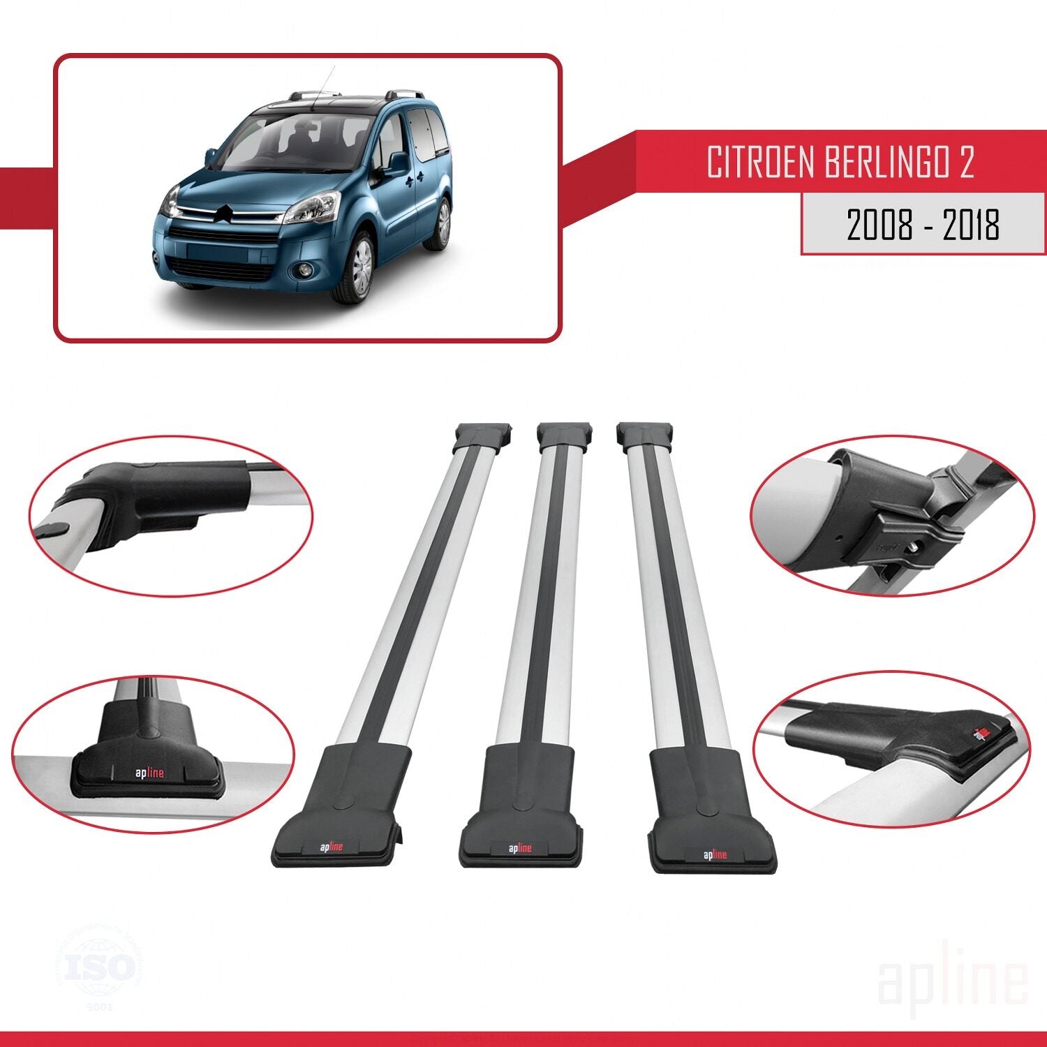 FLY Model Dakdrager bagagedrager compatibel met Citroen Berlingo 2 (B9) 2008-2018 Spoorstaven Grijs Aluminium 3 Staven