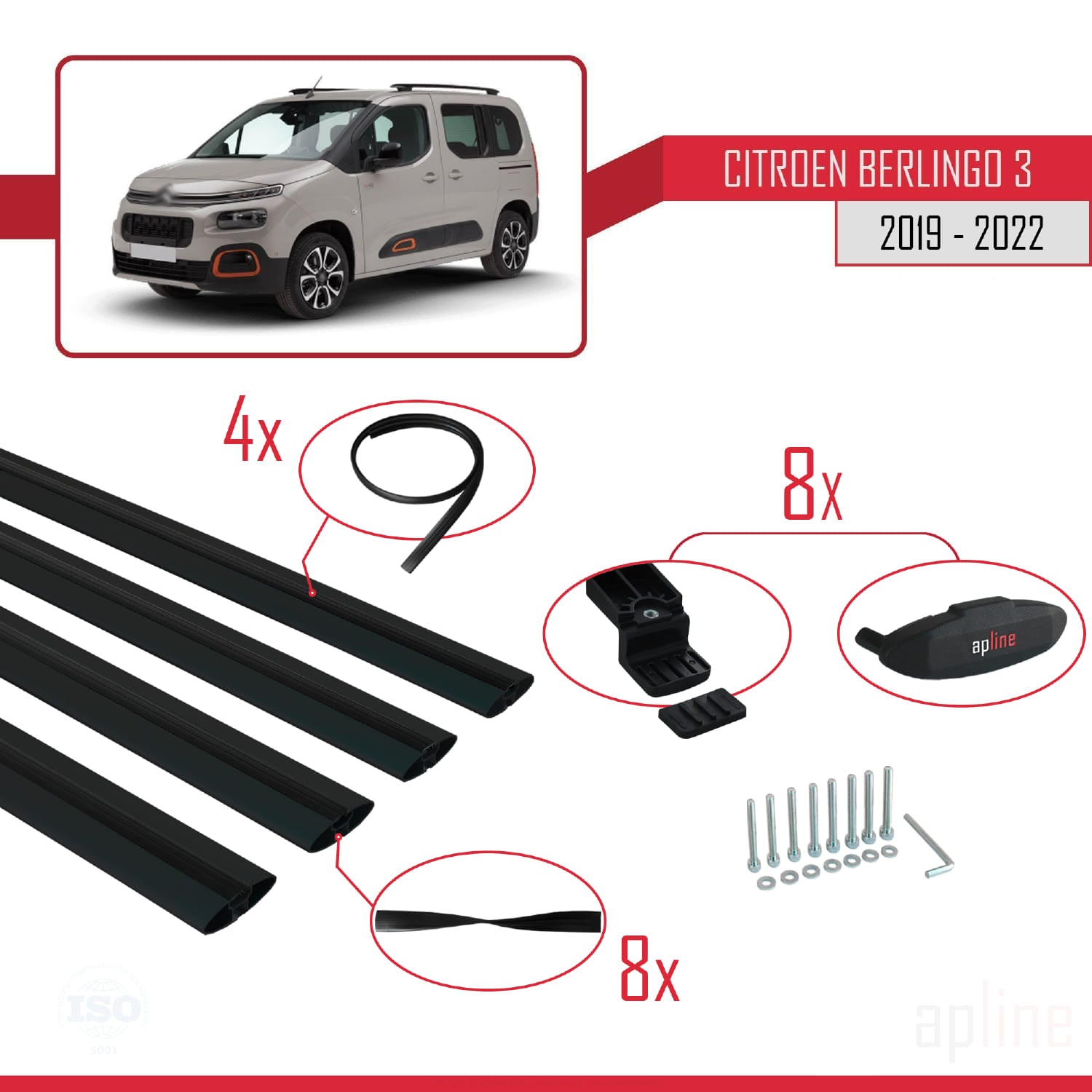 Compatible avec Citroen Berlingo 3 (K9) 2019-2022 BASIC Model Barres de Toit Railing Porte-Bagages de Voiture Noir Aluminium 4 Barres