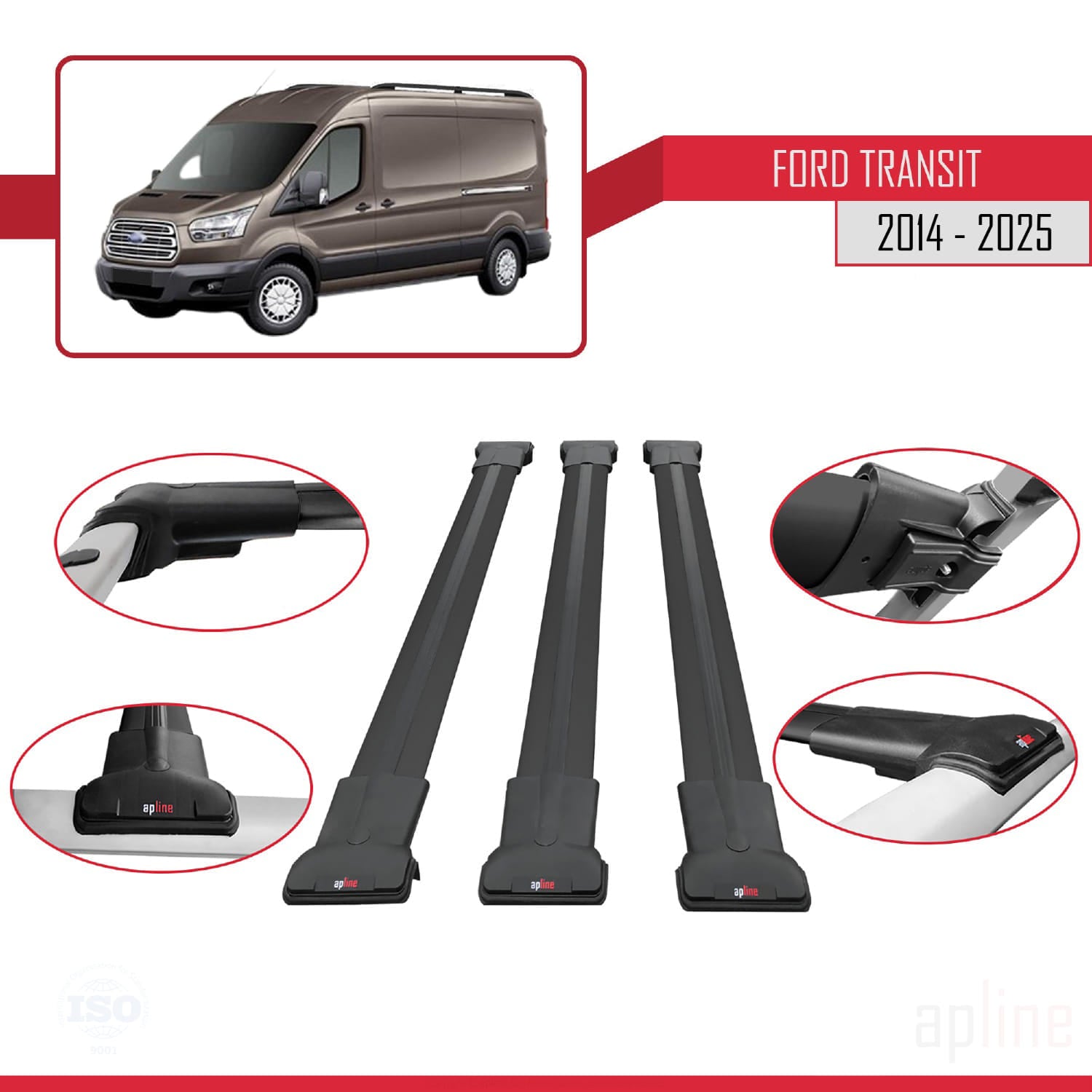 Compatible avec Ford Transit 2014-2025 FLY Model Barres de Toit Railing Porte-Bagages de Voiture Noir Aluminium 3 Barres