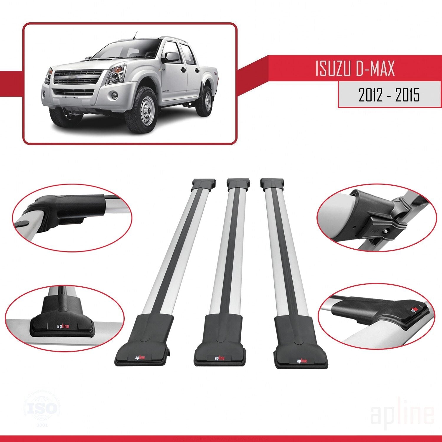 Compatible avec Isuzu D-Max 2 (RT50) Pre-Facelift 2012-2015 FLY Model Barres de Toit Railing Porte-Bagages de Voiture Gris Aluminium 3 Barres