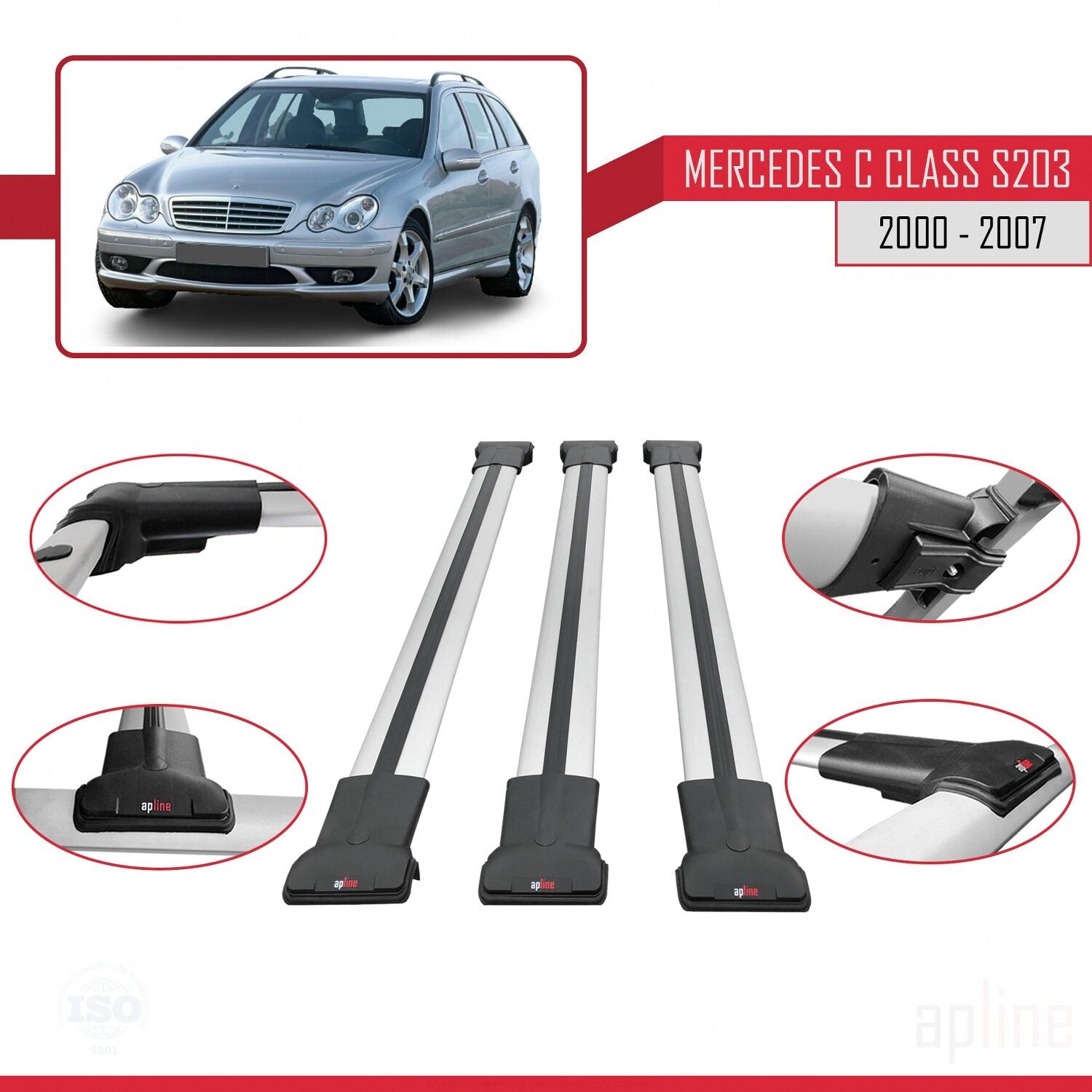 Compatible avec Mercedes Classe C 2 (S203) 2000-2007 FLY Model Barres de Toit Railing Porte-Bagages de Voiture Gris Aluminium 3 Barres