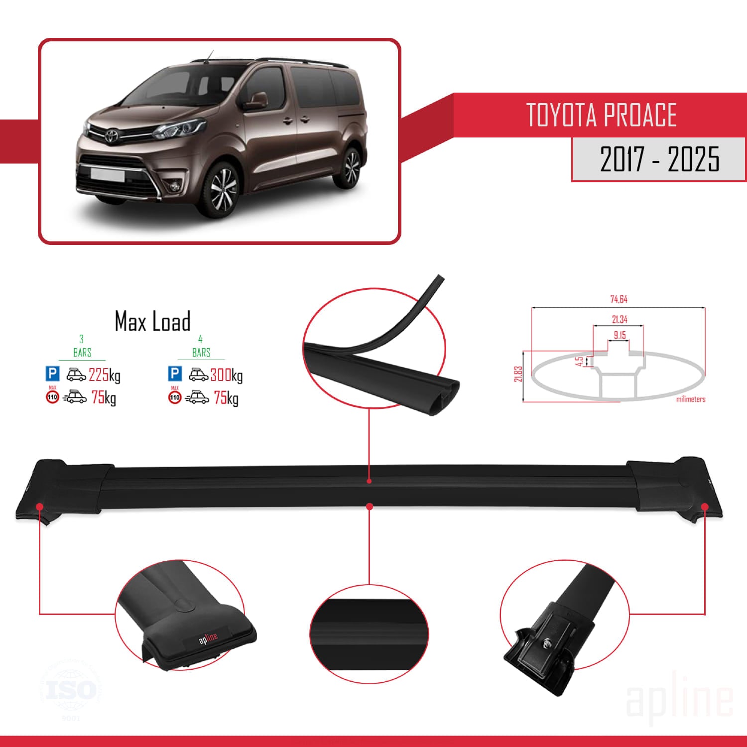 Compatible avec Toyota Proace 2017-2025 FLY Model Barres de Toit Railing Porte-Bagages de Voiture Noir Aluminium 3 Barres