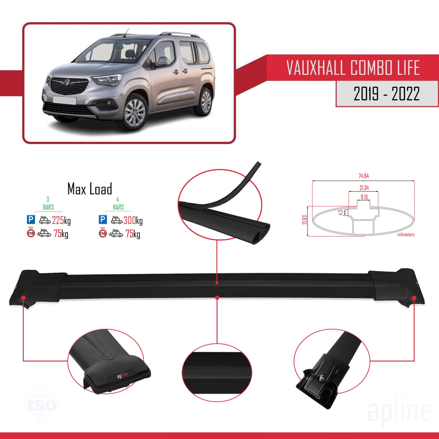 Compatible avec Vauxhall Combo E Life 2019-2022 FLY Model Barres de Toit Railing Porte-Bagages de Voiture Noir Aluminium 3 Barres